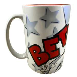Features artwork wrapping around its exterior surface depicting Betty Boop sitting on a motorcycle.