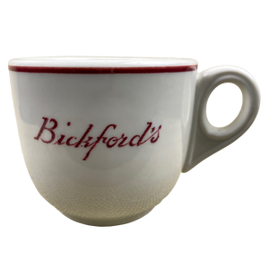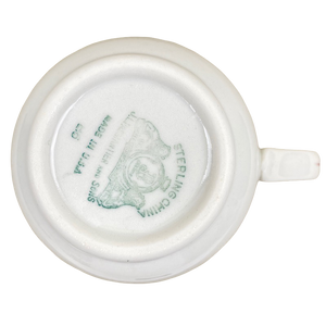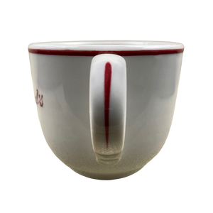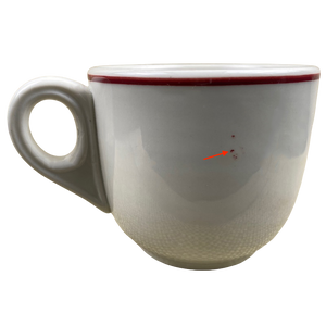 There is a ring of burgundy trim wrapping around the rim, inside the rim, and down the center of the handle.