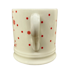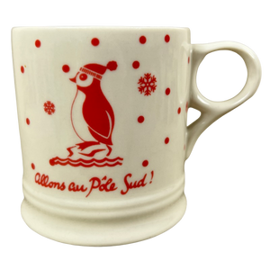 This is a smaller mug that features a penguin wearing a winter hat on its exterior surface.