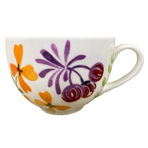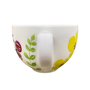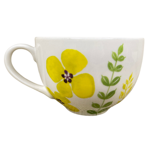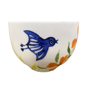 This is a larger mug that features a beautiful floral pattern with a single blue bird wrapping around its exterior surface.