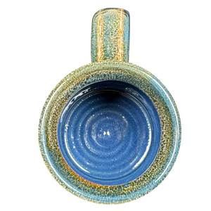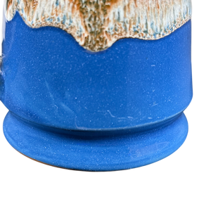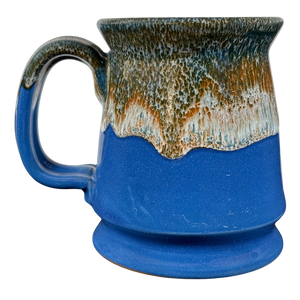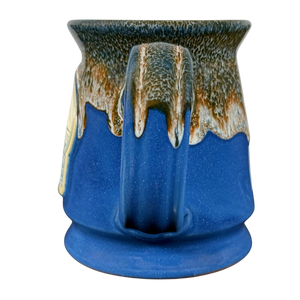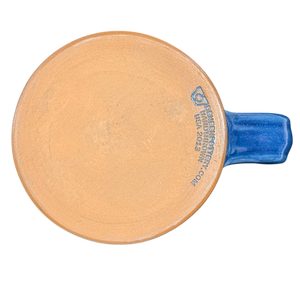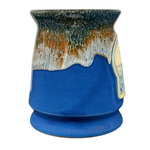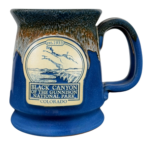 This is a hand thrown pottery mug that features a raised plaque on its front surface with an image of a canyon.