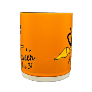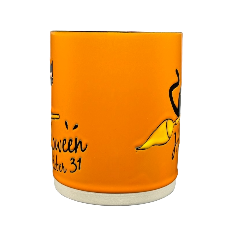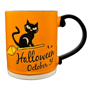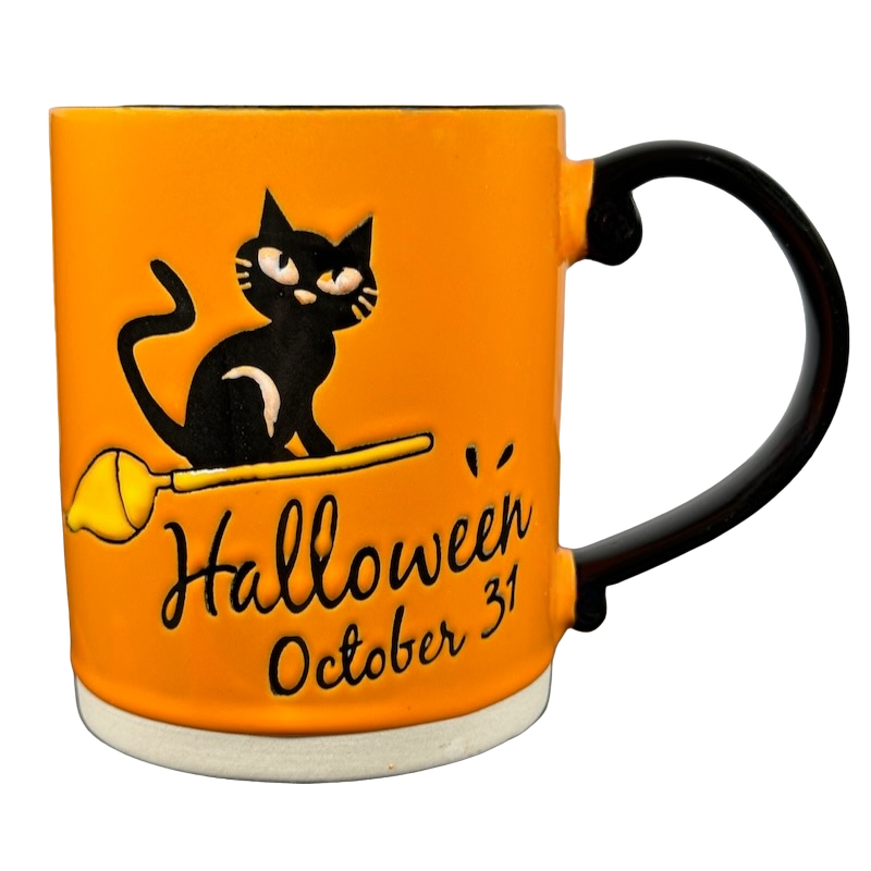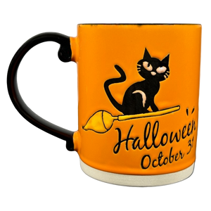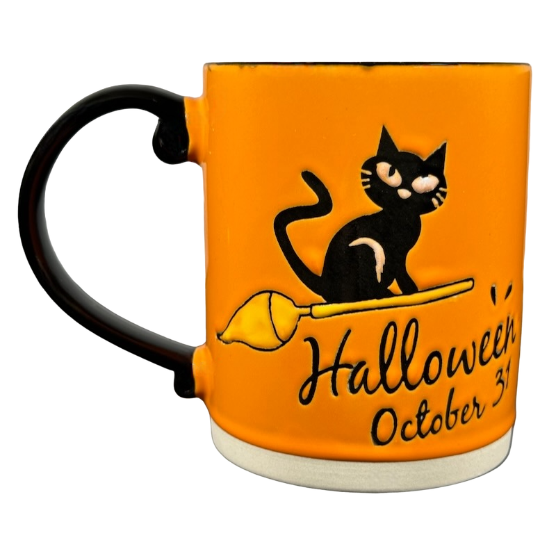 Features the same artwork lightly etched into its front and rear surface. Depicted is a black cat riding on a broom.