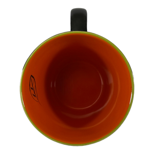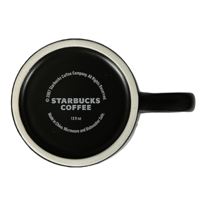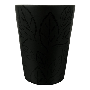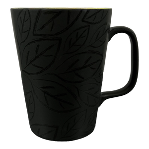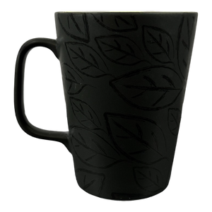 Features a black exterior surface with a leaf pattern wrapping around the mug.