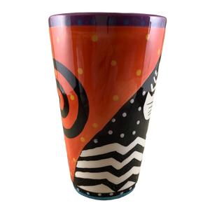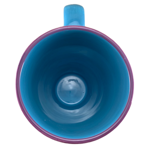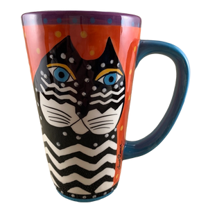 This beautiful mug features colorful artwork wrapping around its exterior surface depicting a black and white cat with blue eyes.