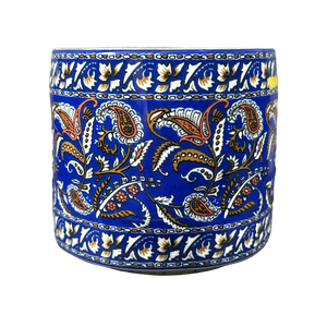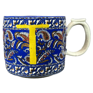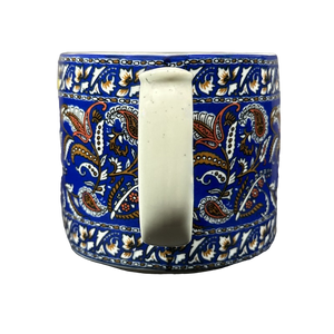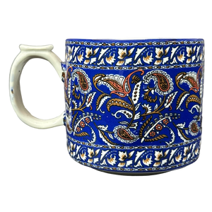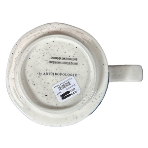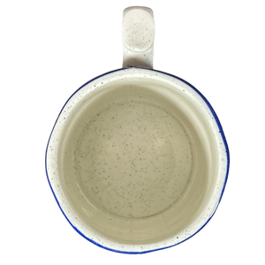 There is a manufacturing imperfection on the side of the handle. It's a slightly depressed small area where the speckled cream pain present on the rest of the handle is absent. It appears that some of the blue and brown paint from the body of the mug was inadvertently applied in and surrounding this small depressed area. Please see the 3rd photo.