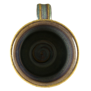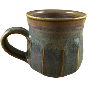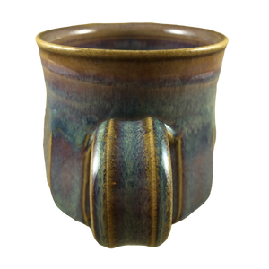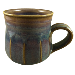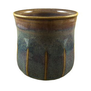 It is finished in shades of blue and brown and features light brown vertical ribs wrapping around its exterior surface. There is also matching ribs on the handle.