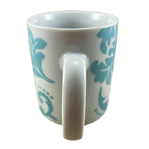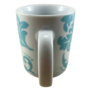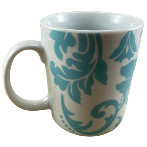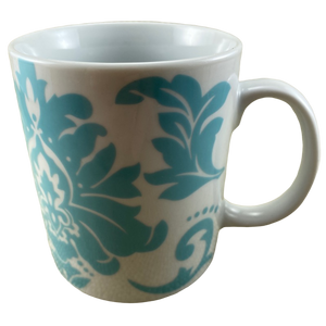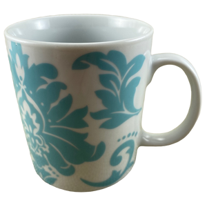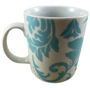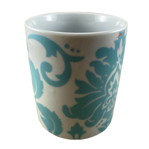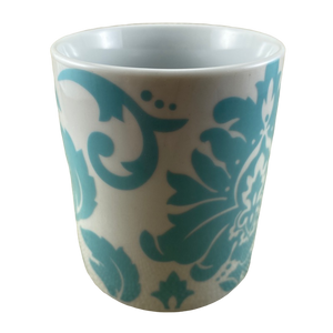 Features an abstract blue damask pattern wrapping around its exterior surface.