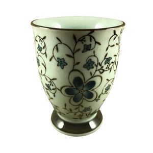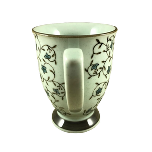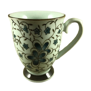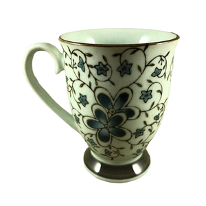 Features a floral pattern encircling the mug consisting of blue flowers with 5 leaves and vines.