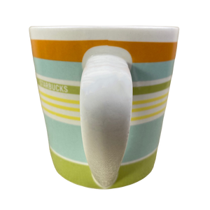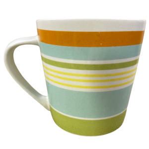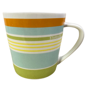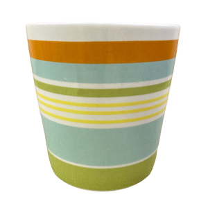 Features blue, orange, green, and yellow horizontal stripes wrapping around its exterior surface.