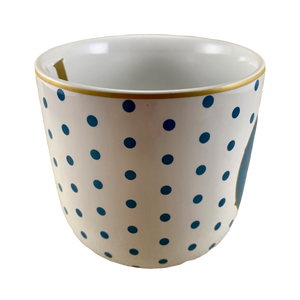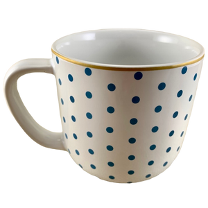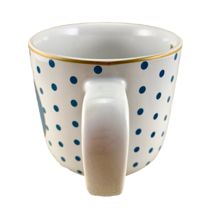 Features a blue polka dot pattern wrapping around its exterior surface.