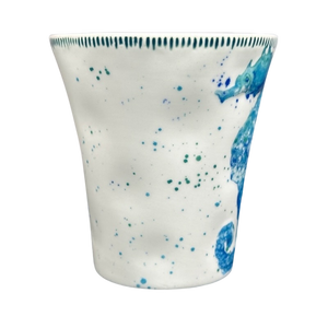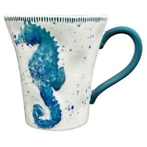Features beautiful artwork wrapping around its exterior surface depicting a blue seahorse.