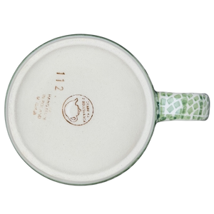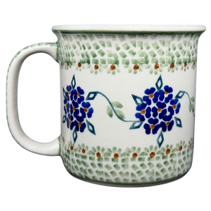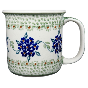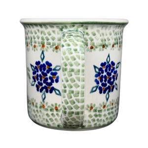 This authentic Boleslawiec Polish pottery mug features a classic cylindrical silhouette decorated with a hand-painted pattern of vibrant blue forget-me-not clusters. The intricate design includes green leaf accents and delicate geometric mosaic borders in soft sage green that frame the central floral vine. A matching mosaic pattern extends along the sturdy handle, while the interior is finished in a smooth, creamy white glaze for a clean look. Handcrafted in Poland, this durable stoneware piece is both microwave and dishwasher safe, making it an ideal choice for bringing traditional artisanal charm to your daily coffee or tea routine.