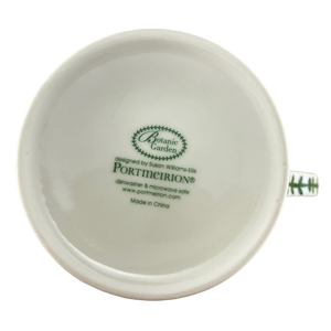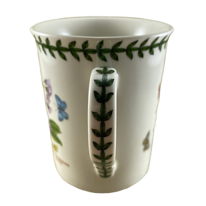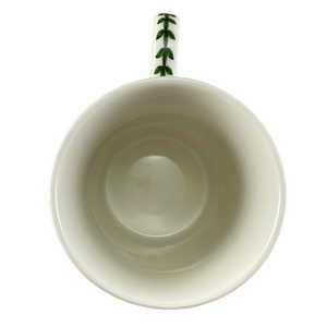 Also features trim composed of leaves wrapping around the upper surface just under the rim and down the center of the handle.