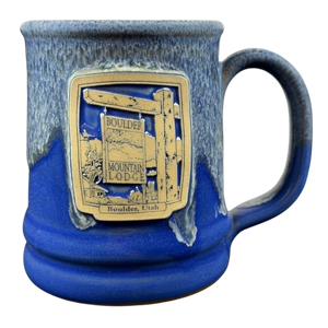 This meticulously crafted mug features a raised plaque displaying the Boulder Mountain Lodge sign. The plaque is inscribed with "BOULDER MOUNTAIN LODGE" and includes the engraving "Boulder, Utah" at its base.