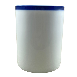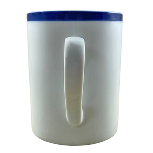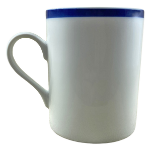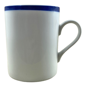 This mug features a blue stripe wrapping completely around the exterior surface just below the rim.