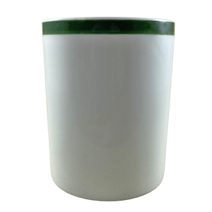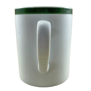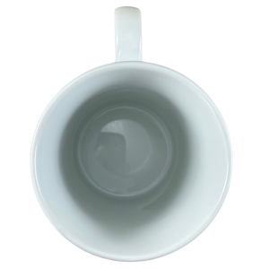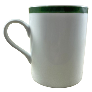 This mug features a blue stripe wrapping completely around the exterior surface just below the rim.