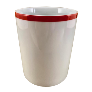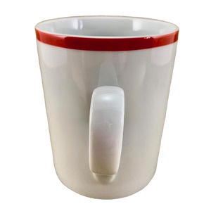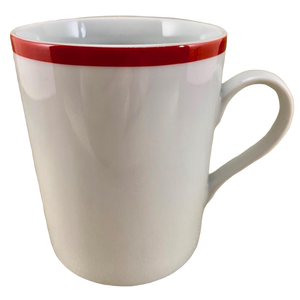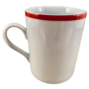 This mug features a red stripe wrapping completely around the exterior surface just below the rim.