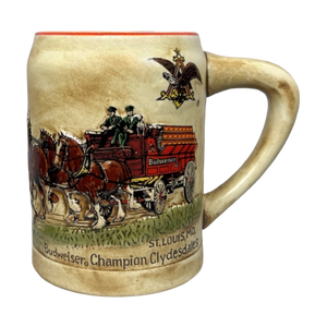 This beautiful stein features embossed artwork on its exterior surface. Depicted are the majestic Budweiser Clydesdale horses pulling a wagon full of cases of Budweiser beer.