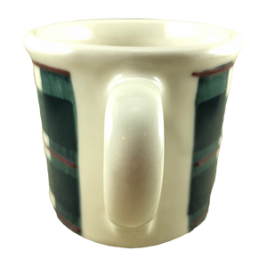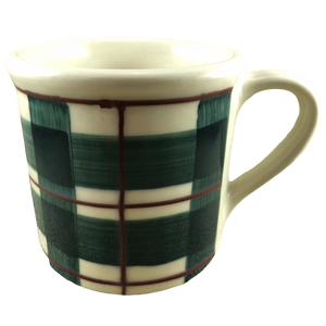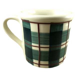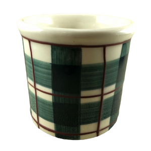 Features a green and white plaid pattern with dark brown lines wrapping around its exterior surface.