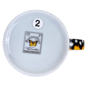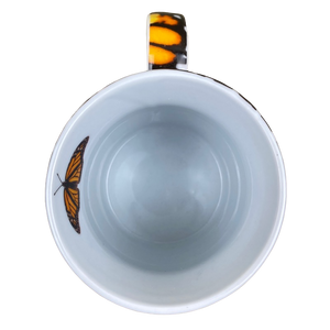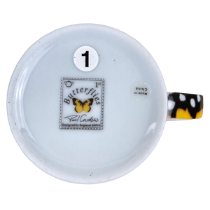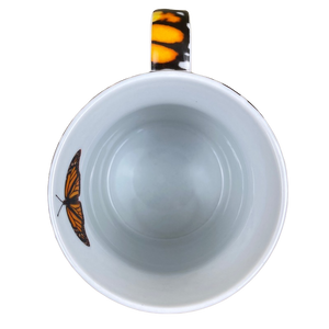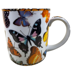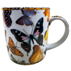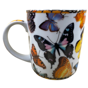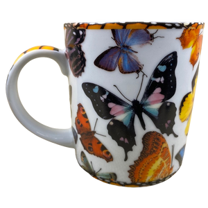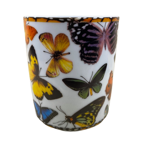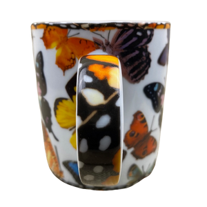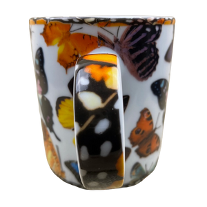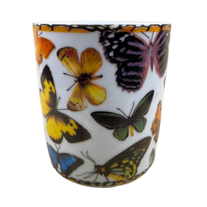 Features artwork wrapping around its exterior surface and on the handle depicting various butterflies.