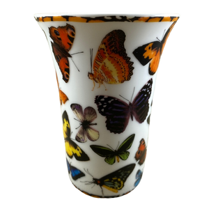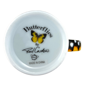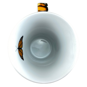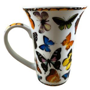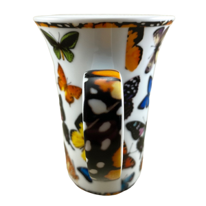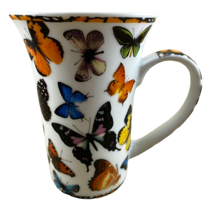 This taller than average mug features artwork wrapping around its exterior surface depicting various butterflies.