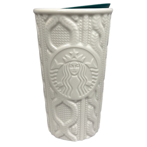 Features embossed artwork wrapping around its exterior surface consisting of a cable knit sweater pattern.