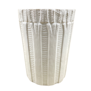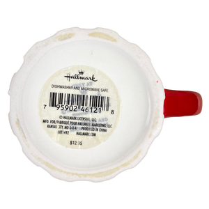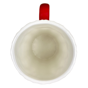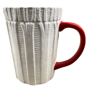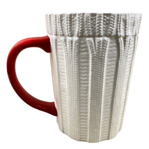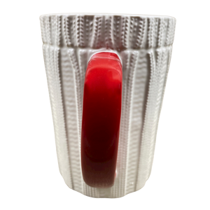 This mug features a cable knit sweater pattern all over its exterior surface and a red handle.