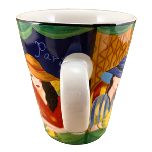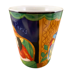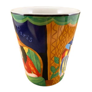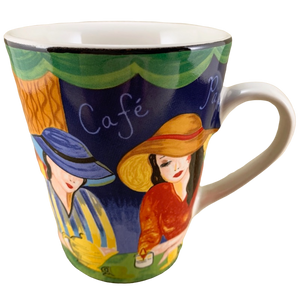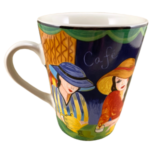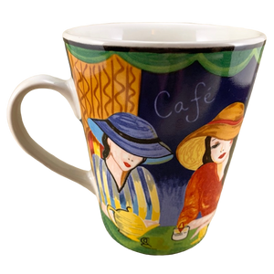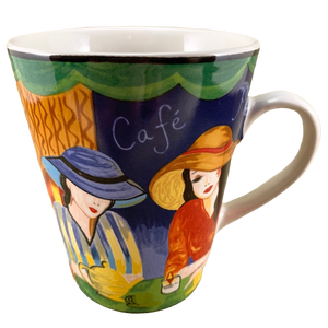 Features the same artwork on its front and rear surface consisting of 2 women sitting at a table.