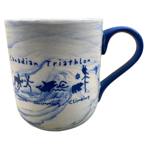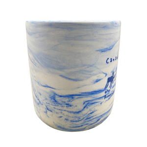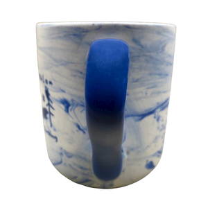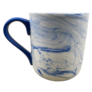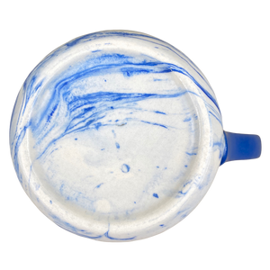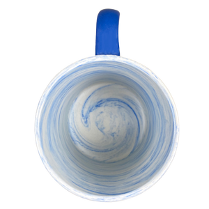 This mug has a marble like finish on its interior and exterior surface and a matching blue handle.