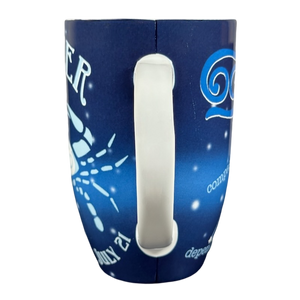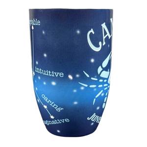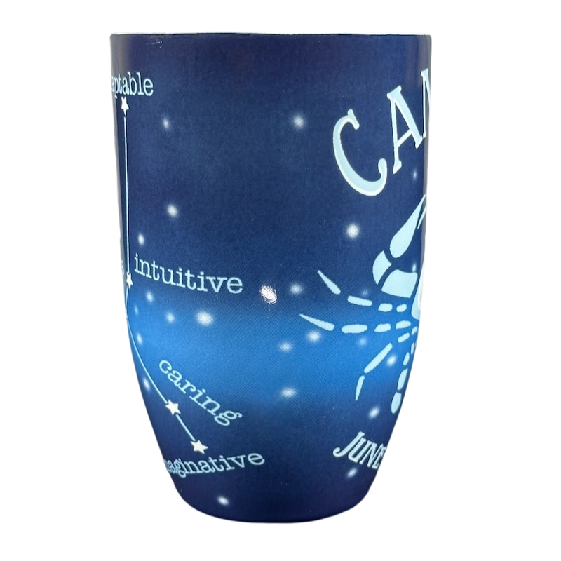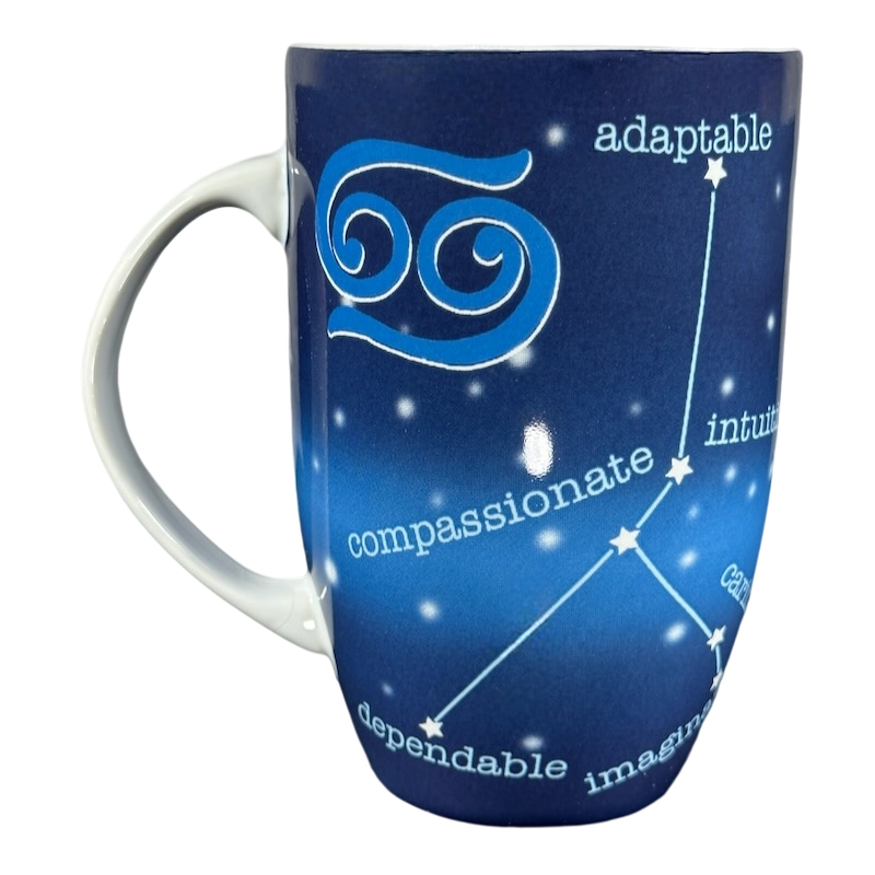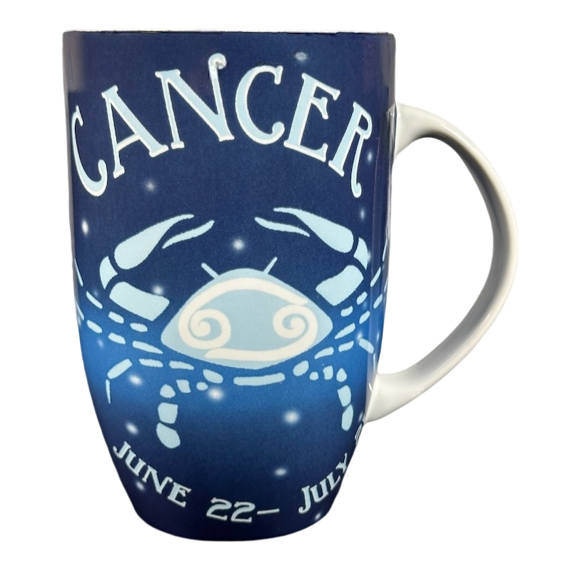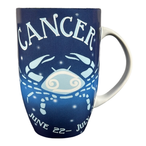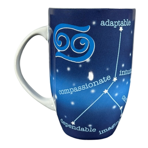 This is a tall mug that features artwork on its front and rear surface depicting the Zodiac sign CANCER.