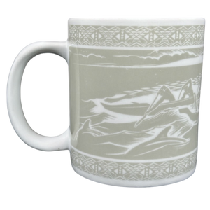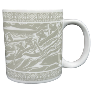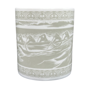 Features artwork depicting people paddling in a boat wrapping around its exterior surface.