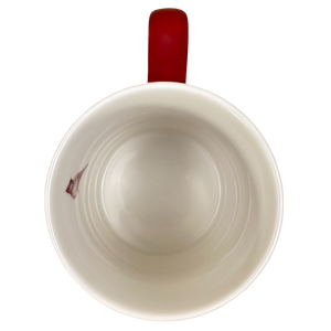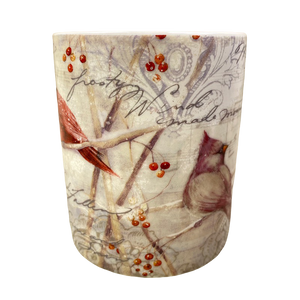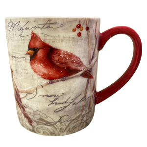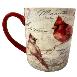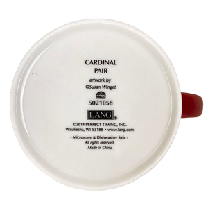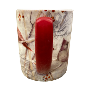This mug features the same beautiful artwork on its front and rear surface consisting of two cardinals sitting on branches.