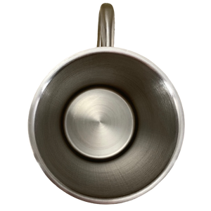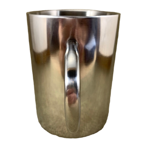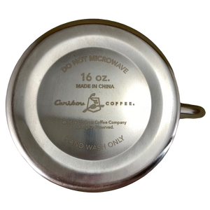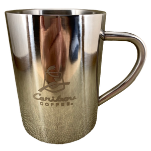 This is a metal mug with a Caribou Coffee logo on its front surface.