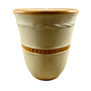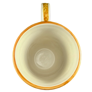 There is contrasting trim on the rim, handle, and around the lowest part of the base.