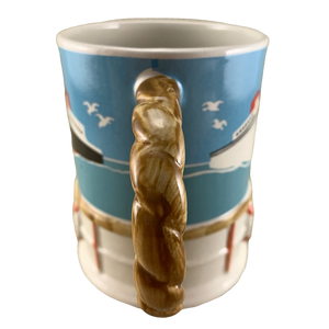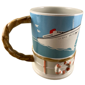 The lower 1/3 of this mug features embossed artwork depicting the ship's railing and life preservers.