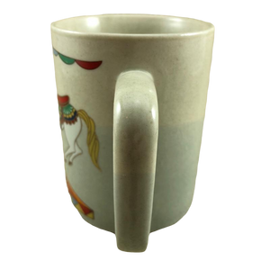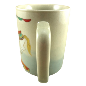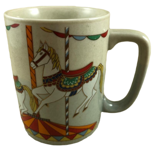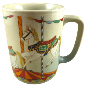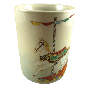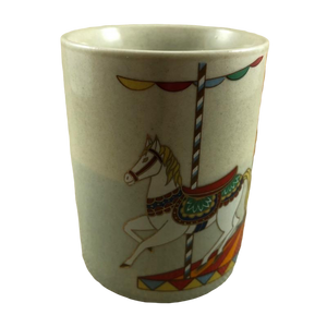 Artwork wrapping around its exterior surface depicts a carousel with 2 horses.