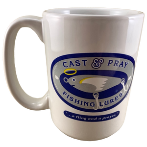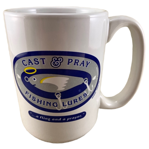Features the same artwork on its front and rear surface consisting of a fishing lure with "CAST & PRAY" printed above it and "FISHING LURES" printed below it. To the left of the lure in tiny print is "FIGHT THE GOOD FIGHT" and to the right of the lure is "HEAVENLY ACTION."