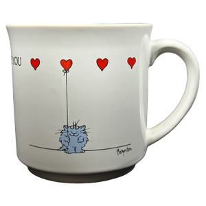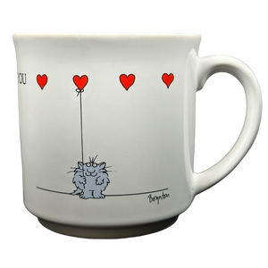 Features a cat on the front lower surface holding a red heart shaped balloon.