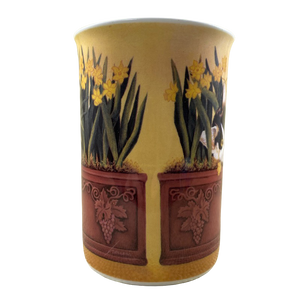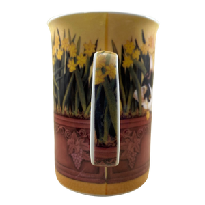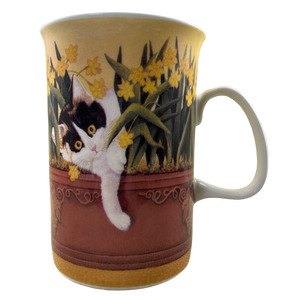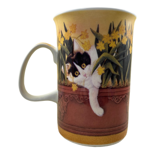 Features the same artwork on its front and rear surface depicting a black and white kit in a planter full of Daffodils.