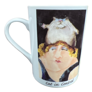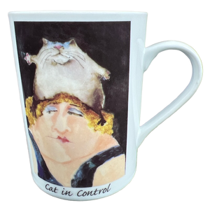 Features the same artwork on its front and rear surface. This artwork consists of a cat sitting on top of a woman's head.