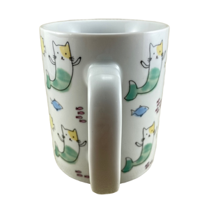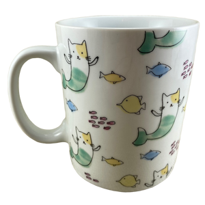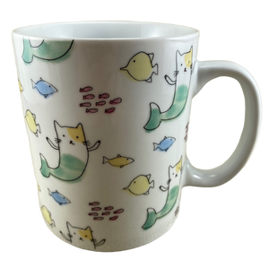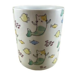 It features whimsical artwork wrapping around its exterior surface consisting of a creature that is a combination of a cat and a fish (a catfish?) and also normal looking fish of various sizes.