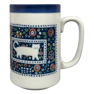 Features lightly embossed artwork on its front surface depicting a cat inside of a blue rectangular dot frame.