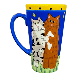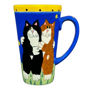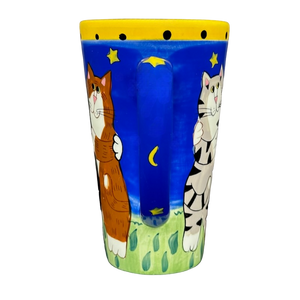 Features a different pair of cats on its front and rear surface hugging at night under the stars.