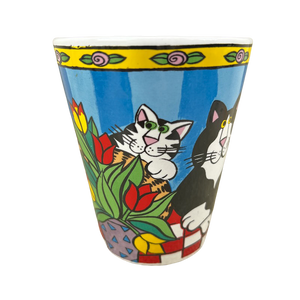 Features colorful artwork wrapping around its exterior surface consisting of cats and flowers.