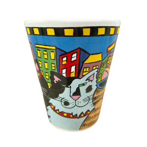 Features colorful artwork wrapping around its exterior surface consisting of cats in front of buildings.