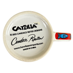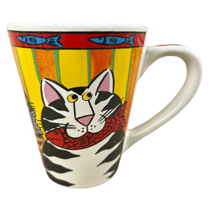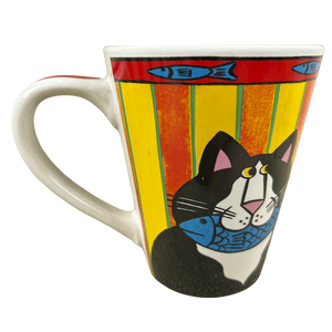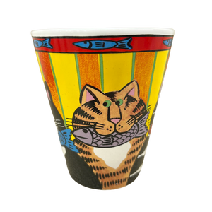 Features colorful artwork wrapping around its exterior surface consisting of cats with fish in their mouths.
