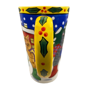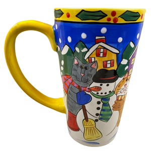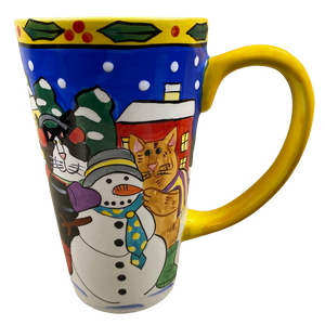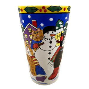 Features colorful artwork wrapping around its exterior surface consisting of cats and snowmen.