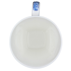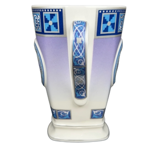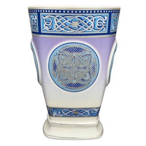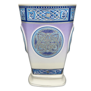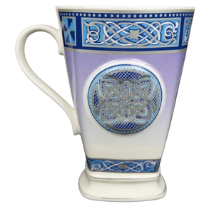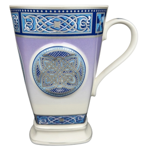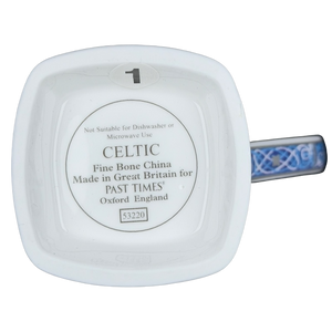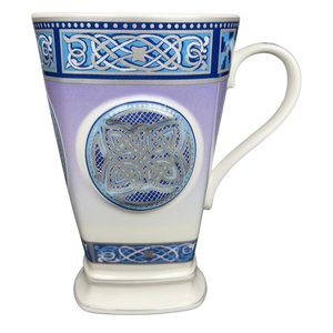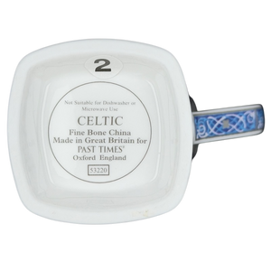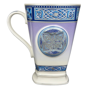 This elegant Celtic fine bone china mug features a refined pedestal silhouette accented with intricate blue and silver Celtic knotwork set against a soft lavender ombré field that fades into creamy white. Circular medallions showcase detailed interlacing designs, while coordinating knot motifs wrap the rim, base, and handle for a cohesive, ornamental look. Crafted in Great Britain for Past Times of Oxford, England, the base stamp confirms its fine bone china construction and care guidance, making this a beautifully decorative and collectible piece suited for display or gentle use.