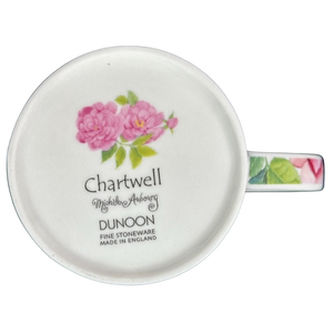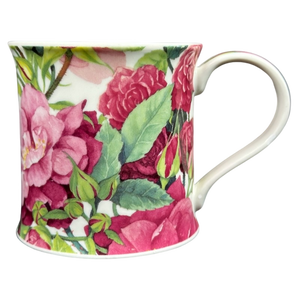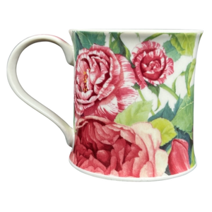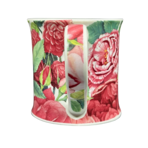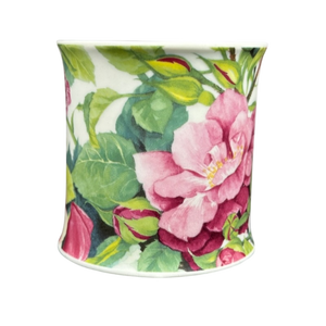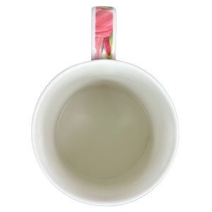 Features pink flowers and green leaves wrapping around its exterior surface and on the handle.