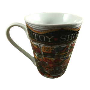 Features the same image on the front and the rear of two chilrdren staring into the window of the village toy shop.